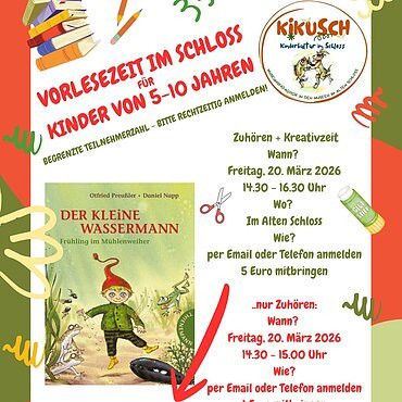 Im März geht es bei der Vorlesezeit im Schloss um den „Kleinen Wassermann“. Kinder können am 20.03. um 14:30 Uhr die Geschichte mit einem Bilderbuchkino in den Museen im ...